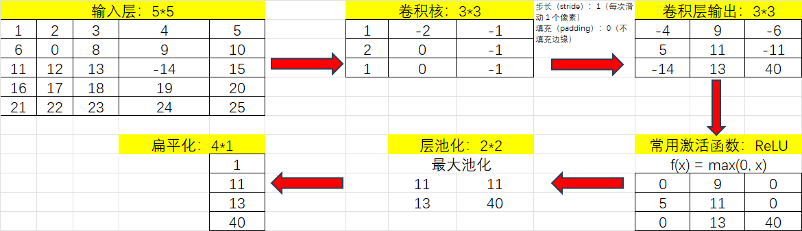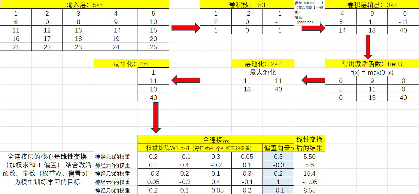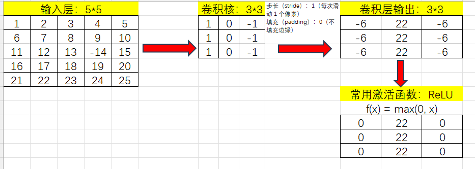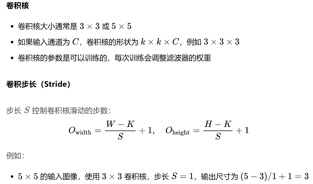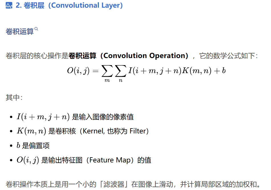 - 每次滑过时,计算当前区域的加权求和; 这样提取出不同层次的特征(比如第一层提取边缘,第二层识别形状,第三层检测复杂对象)