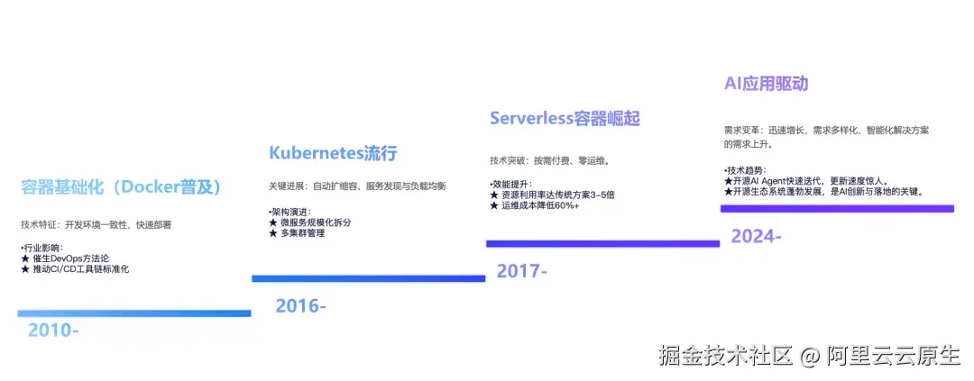 过去的"裸机+脚本"时代,部署繁琐、扩容低效、故障频发;随后 Docker 与 Kubernetes 将算力进一步抽象,但自建集群仍需维护节点与控制面,稳定性与人力成本难以平衡。而进入 AI 时代后,仅仅"跑得稳、跑得快"已不够,企业还需要打通模型、工具链、知识库的体系化支撑与生产级治理。