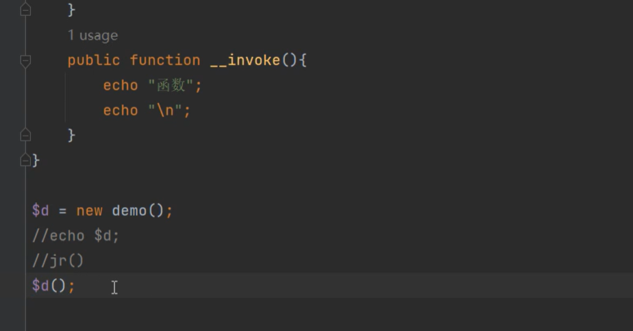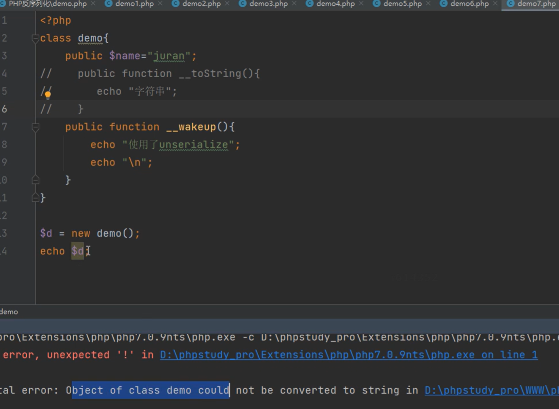 tostring() //把对象当成字符串调用时触发,把class定义的对象demo当做字符串ehco输出,就会调用