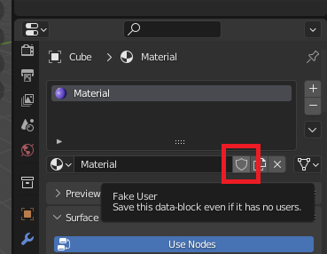 4.在材质设置中,有一个图标叫做假用户(FakeUser),该功能的意思是Blender会在关闭时删除没有用到的材质球,勾选假用户表示给该材质球指定一个假的使用者,让其不会自动被销毁。