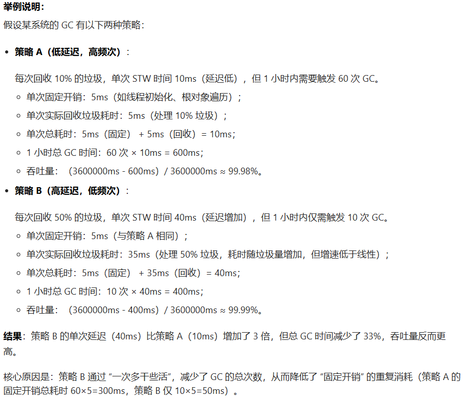 **1.1.**GC 操作本身是有 "固定开销" 的(如初始化 GC 线程、遍历根对象、更新内存管理元数据等),这些开销与回收的垃圾量无关。若 GC 触发过于频繁(每次只回收少量垃圾),这些固定开销会被反复叠加,导致 GC 总时间急剧增加;而适当延长单次 GC 的延迟(让 GC 一次处理更多垃圾),可减少 GC 次数,从而降低固定开销的总占比。比如