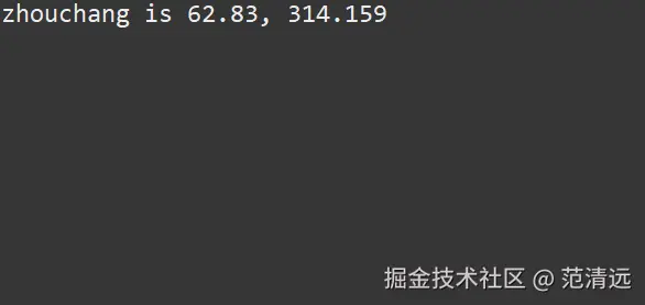 这句话与刚刚的不一样,在最后使用了 printf(print:打印;f:format:格式)代表最后打印出来要按照一定的格式,而格式可以我们来定,那么zhouchang is %.2f, 这句话就是我的格式 我输出是按照这个方式输出的,那么 %.2f是什么意思呢? 指的是这个地方的数据输出的话必须是一个2位小数。 后面跟着的zhouchang就是传入到%.2f 然后使用两位小数输出。