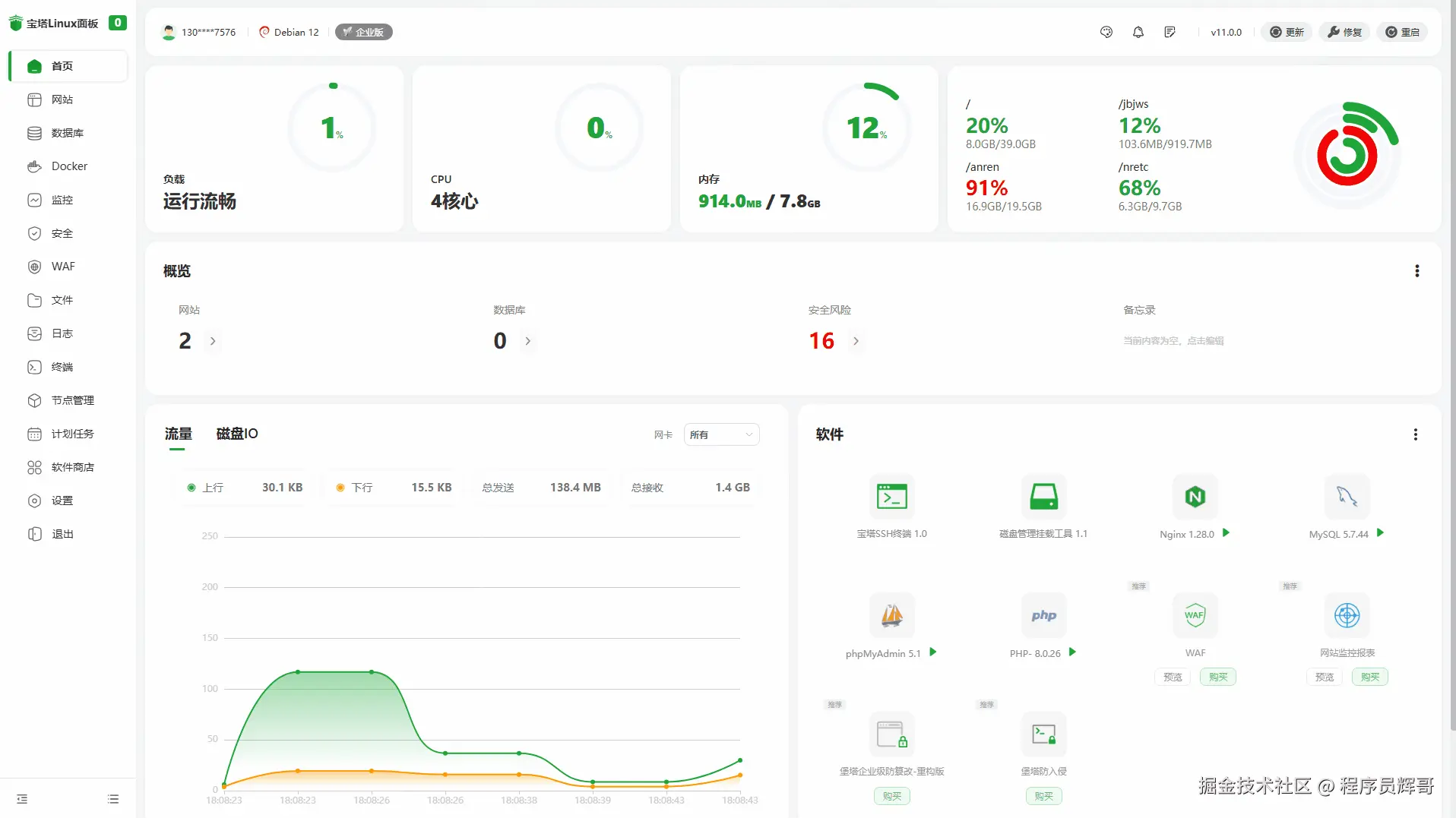 如果你不会敲命令,也有一些免费的可视化运维工具可以使用,比如宝塔面板,直接通过界面进行软件的安装,对比命令的方式可能会有一些限制,但是日常使用完全没问题