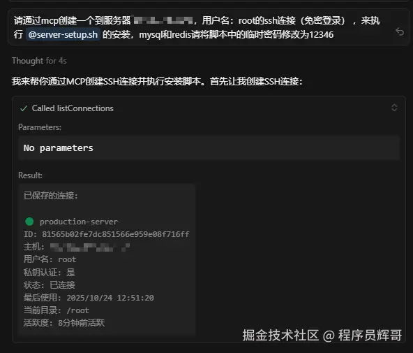 对于一些个人开发者来说,会经常性的跟服务器打交道,在我们ssh工具上,可能有一堆的服务器连接,这里我也推荐借助AI的能力,通过MCP的方式来更高效的运维服务器,包括应用的部署与发布