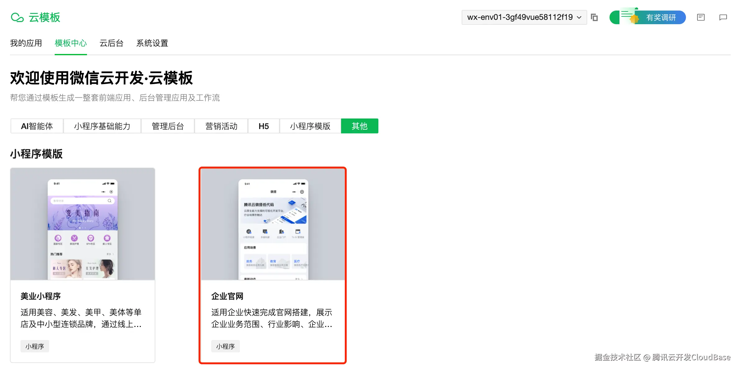 注:在创建项目之后,可通过微信开发者工具右上角的云开发 ->云模板 ->模板中心进入