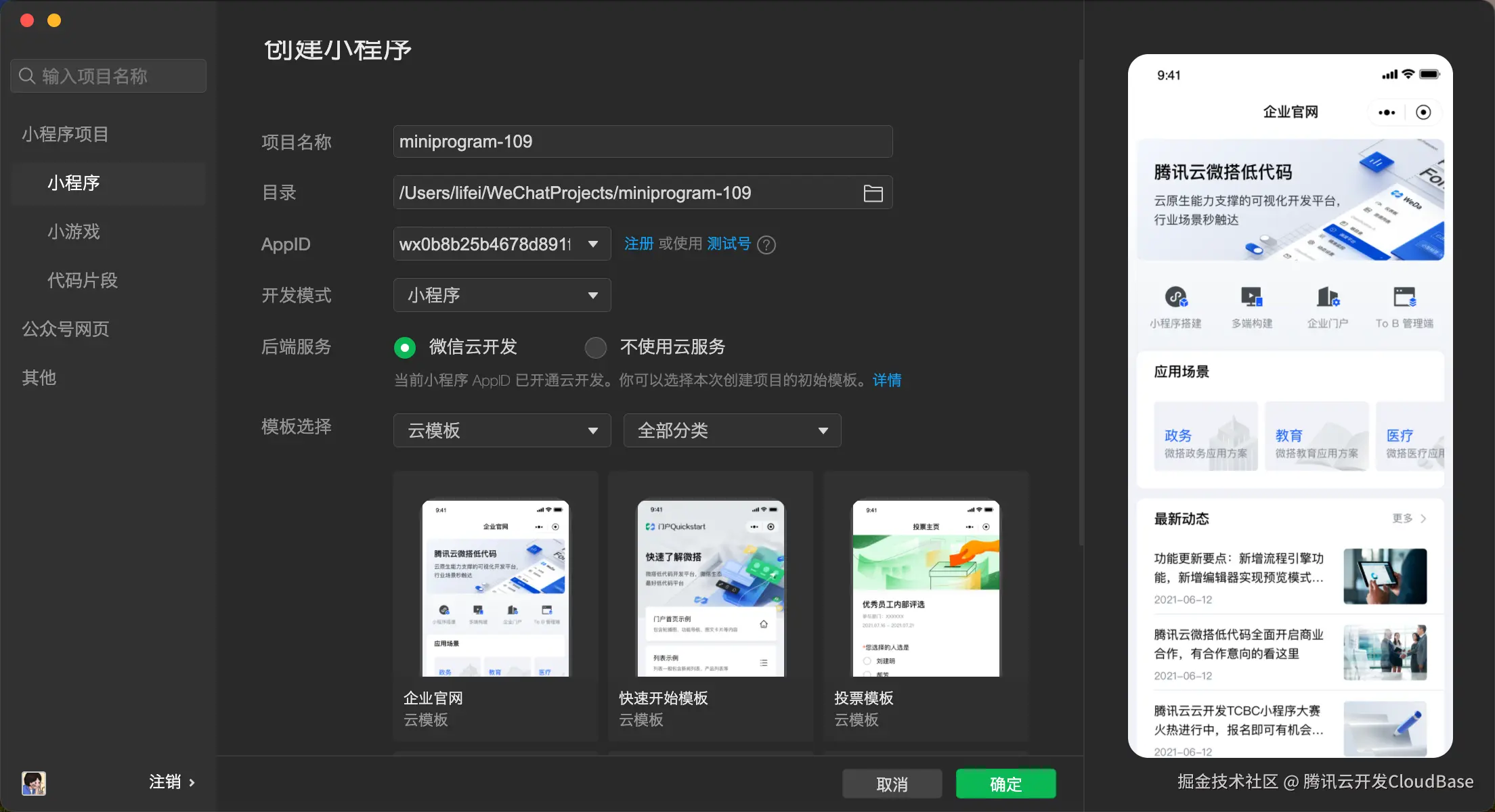 在微信IDE创建项目入口找到 企业官网 云模板,点击 确定 按钮,等待安装完成。