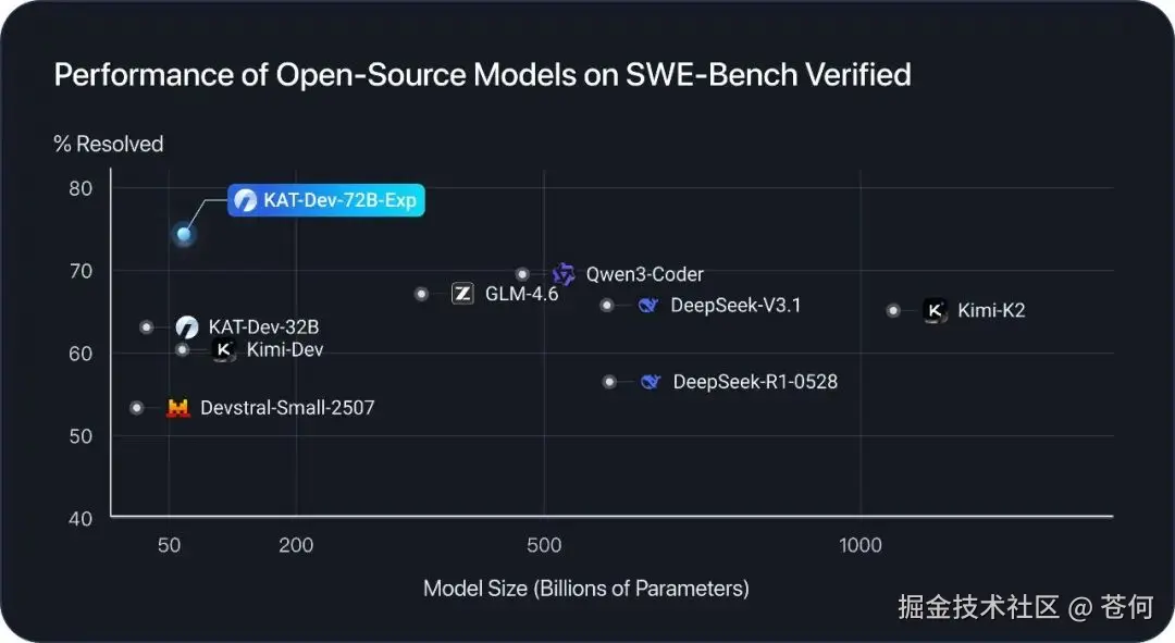 前阵子,他们开源的代码模型 KAT-Dev-72B-Exp 就在 SWE-Bench 认证榜单中以 74.6% 的成绩夺得了开源模型第一。