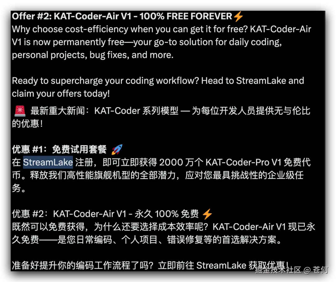 为了测试模型的能力,我还实际测了几个 case 来看看模型效果。我用的是快手 StreamLake 平台的 API,看它有限时免费套餐,新用户注册就有 KAT-Coder-Pro V1 2000 万 Tokens (看了下另外的 KAT-Coder-Air V 1 的 API 是永久免费的)
