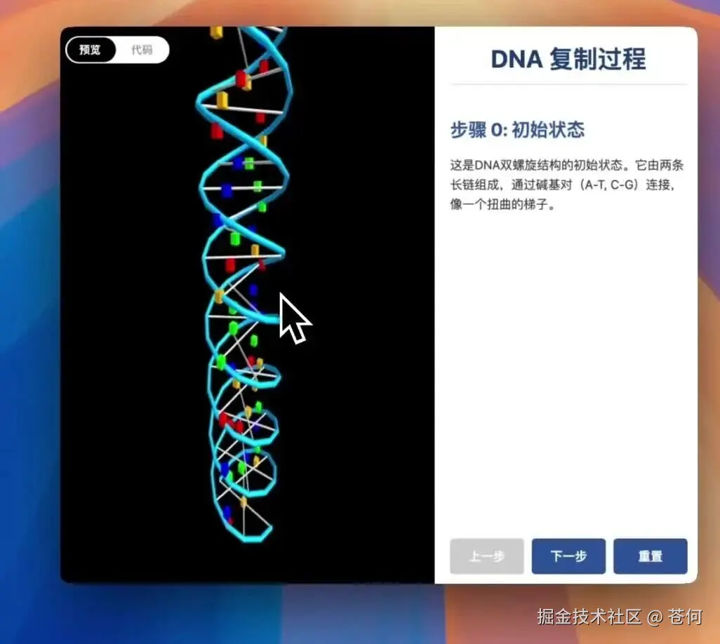 这个 case 主要展示大模型来生成 3D 演示动画,像中学生演示 DNA 双螺旋的复制过程。