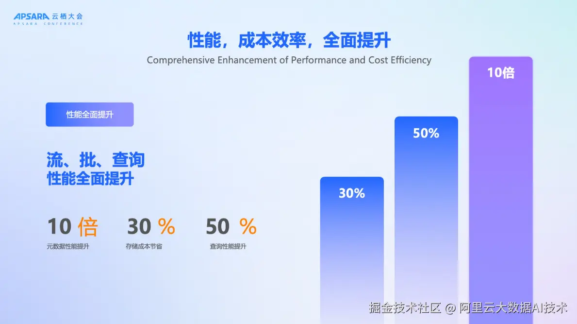 DLF 3.0在性能与成本上实现跨越式提升,元数据访问性能提升10倍以上,存储成本降低30%,查询性能提升50%。我们希望Lakehouse不再是"昂贵玩具",而是高性价比,具备普适性的数据基础设施。