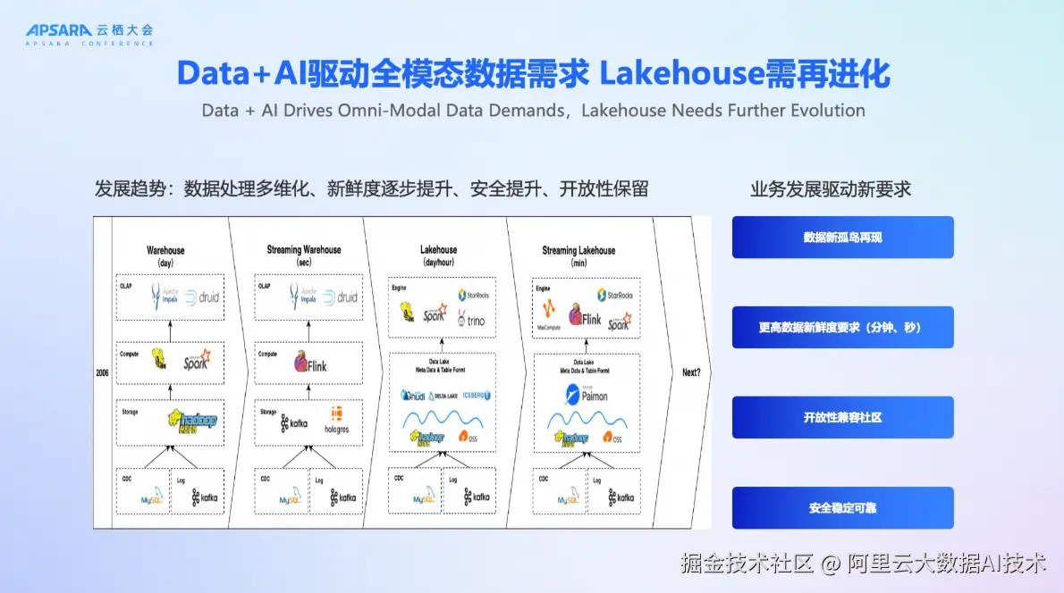 在这样的背景下,Lakehouse架构应运而生,并持续演进。阿里云观察到四大核心趋势正在驱动Lakehouse的下一轮升级: