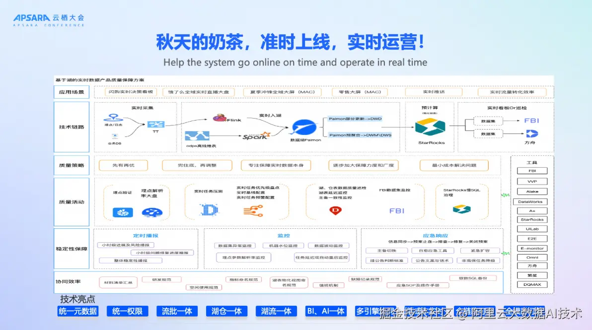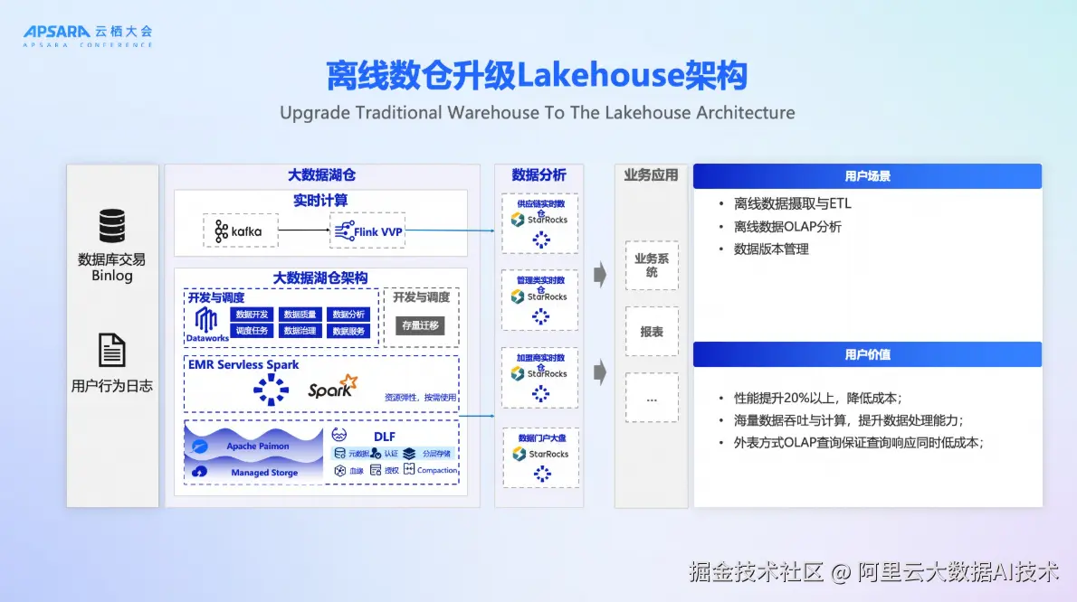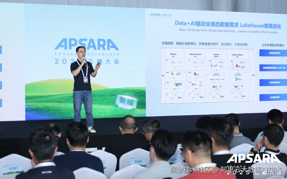在2025年秋季,阿里云DLF 3.0成功支撑了阿里巴巴集团闪购业务的准时上线。该业务对数据实时性要求极高,需在秒级内完成用户行为分析、库存预警与营销决策。因为在去年阿里巴巴集团就做了Alake项目,基于Lakehouse架构构建了整个平台,所以基于DLF可以让流批做更好地融合。面向用户场景会有BI场景、AI场景,这套架构可以很好地兼容两种场景的使用,灵活选择多种引擎应对业务方的需求。