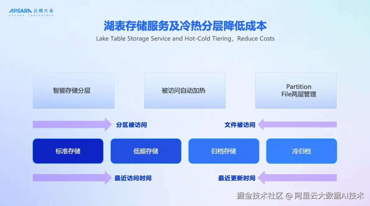 DLF 3.0推出Managed Storage Service,实现存储成本与性能的平衡。DLF基于智能的冷热分层来解决数据合理规划的问题,可以基于读取时间、更新时间的关键事件来决定分区该用什么样的存储介质来承载,同时也可以基于数据的读写行为来对数据做更合理的加速和预热,帮助用户在合理规划存储介质的过程中能够保持数据读写和管理的效率。
