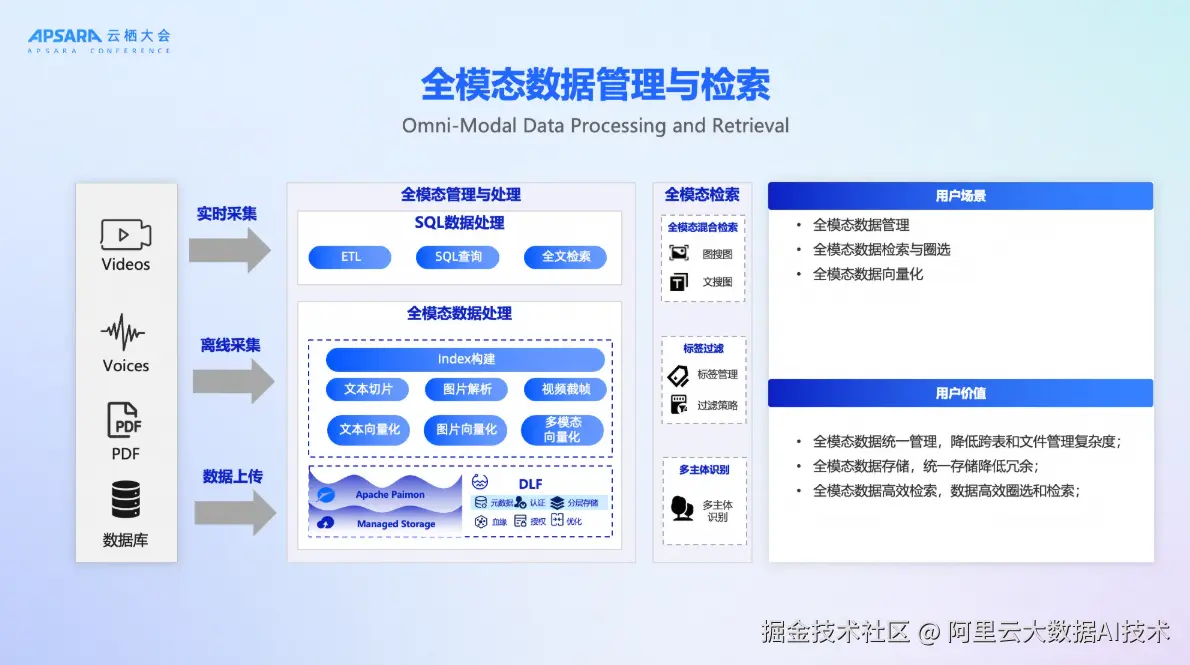 DLF 3.0最引人注目的创新在于全模态数据支持。随着AI时代的到来,大家听到更多的是非结构化数据该怎么管,非常多的视频、图片数据该如何管理,该如何圈选我的DataSet。通过DLF平台可以将非结构化数据,包括视频、音频、PDF进行管理,同时原来这套结构化数据也可以进一步接入。通过实时采集或者离线采集或者数据上传的方式接入到DLF平台,同时通过Lance这样一套底层能力来构建全模态数据的存储、管理以及后续承载embedding数据接入的能力。