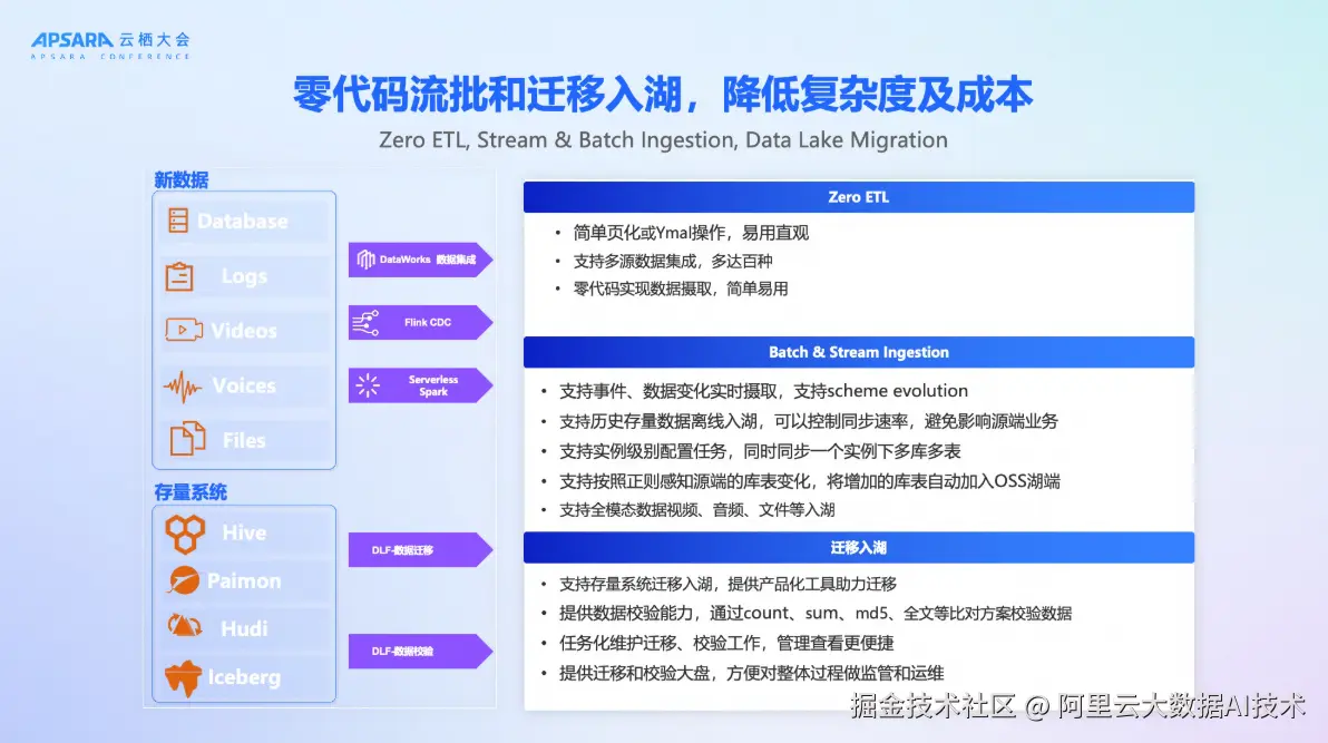 实时入湖:通过Flink CDC实现数据库Binlog的全实时捕获,支持Schema Evolution等; 离线入湖:借助Serverless Spark,按调度或事件驱动批量写入; 全模态入湖:支持视频、音频、文档等非结构化数据通过Dataworks数据集成、Spark、Flink等实时离线一体化数据写入或直接上传入湖; 存量迁移:提供产品化迁移工具,支持Hive、Hudi、Iceberg等旧系统迁移,并内置数据校验(Count/Sum/MD5/全文比对)确保一致性。 这套方案可以降低用户在数据摄取过程中的复杂度,帮助用户更低成本地将数据入湖,更低成本地将存量系统升级到Lakehouse架构。