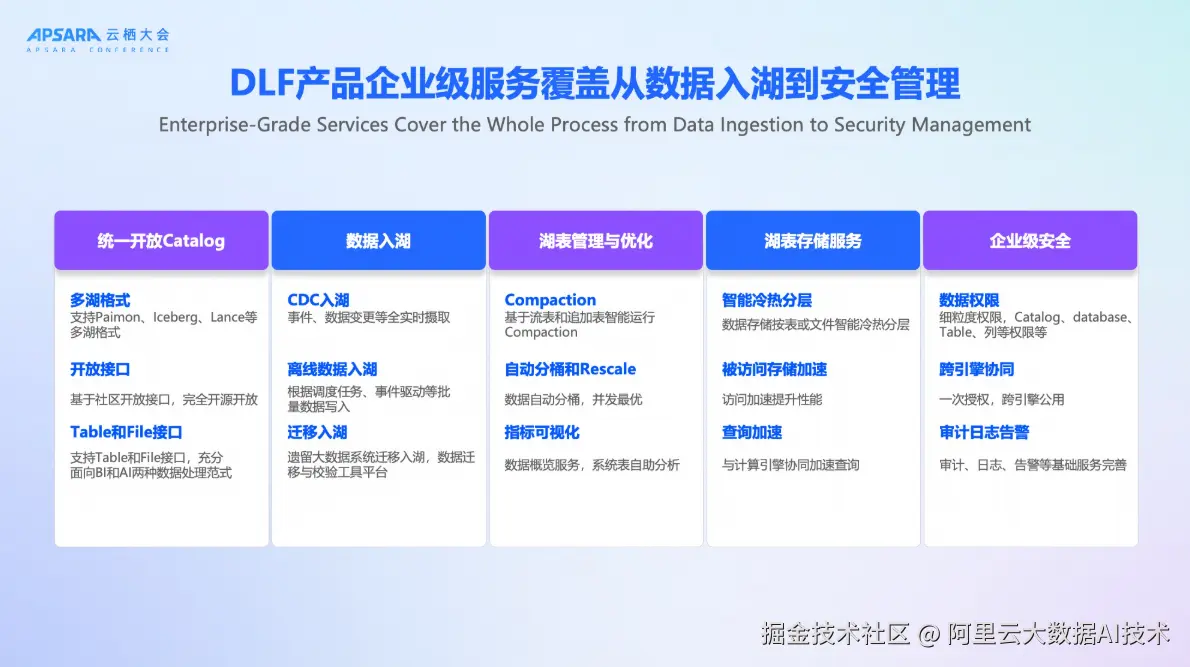 通过一系列重磅升级,DLF产品以统一开放catalog为基础,整体功能覆盖从数据入湖、湖表管与优化、湖表存储服务、企业级安全等丰富功能,让用户离线数据、实时数据、存量系统迁移平滑入湖,同时实现更高效的湖表存、管、优化,真正实现安全开放可靠的湖仓平台。