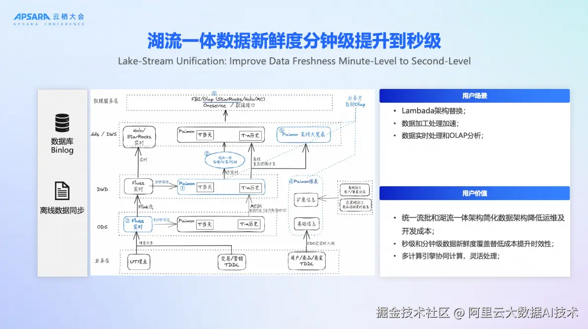 该方案成功替代Lambda架构,统一了湖流处理链路,降低开发与运维成本,同时满足秒级与分钟级的分析需求。