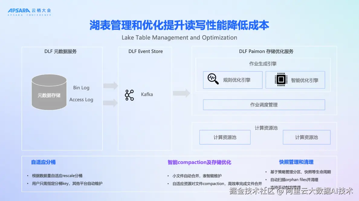 DLF 3.0内置智能优化引擎,自动处理湖表维护中的复杂问题,这些能力大幅降低用户运维负担,让Lakehouse真正"开箱即用"。