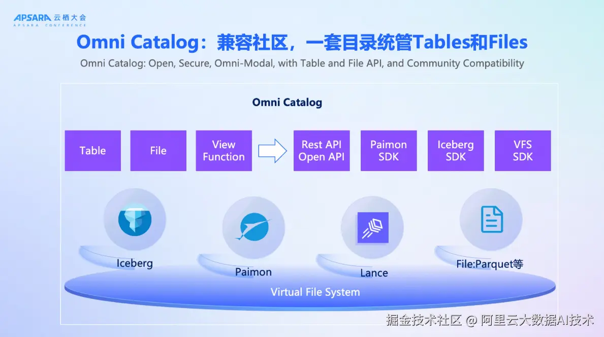 DLF 3.0发布Omni Catalog,这是其全模态能力的基石。Omni Catalog不仅支持Paimon、Iceberg、Lance等主流湖表格式,还首次引入对文件(如Parquet、视频、音频、PDF)的原生管理能力。