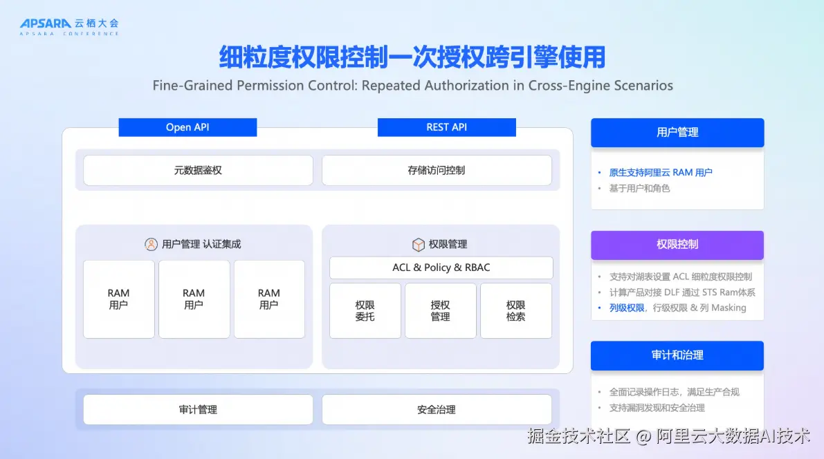 原来自己搭建的Lakehouse平台下,数据权限管理是非常松散,甚至用AKSK这样一套方案是非常有挑战的,DLF提供细粒度的权限管理,可以做到粒级别的数据权限管理,基于table、DataBase、Catalog这些层面都可以做到更好的数据权限管理。基于这套数据权限管理也做了数据的共享,因为有跨团队的协同,所以提供了数据共享的能力来帮助大家更好地做数据协同。