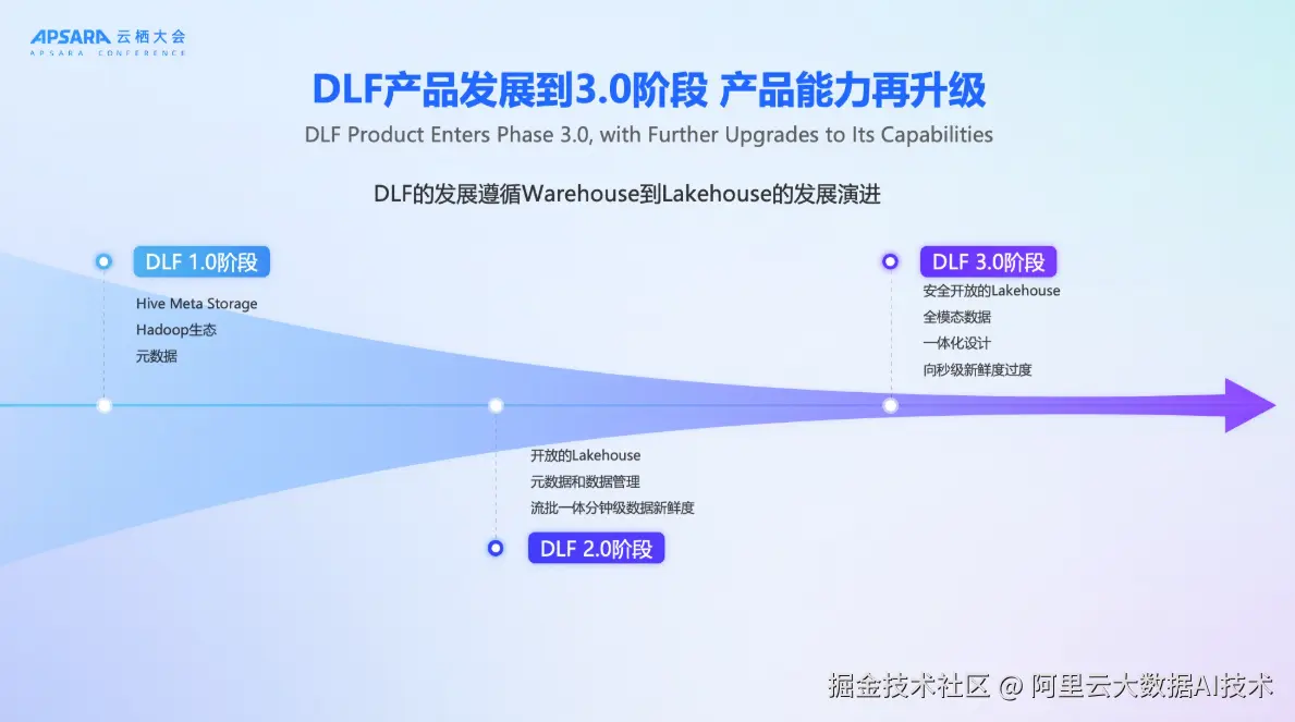 随着Lakehouse架构逐步取代传统Hadoop体系,DLF在2.0阶段完成了关键转型:从元数据管理工具升级为面向Lakehouse的开放元数据与数据管理平台。该阶段支持Paimon、Iceberg等主流湖格式,实现流批一体、分钟级数据新鲜度,并帮助用户平滑迁移至Lakehouse架构。