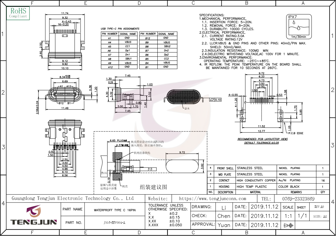 在户外电子、车载后装、工业控制等场景中,连接器需同时承载"高密度信号传输""严苛环境防护"与"长期插拔可靠性"三重需求。TENGJUN JN16-BPF004-A防水TYPE-C 16PIN连接器,以"16PIN高密度引脚+IPX7防水+沉板1.4mm超薄设计"为核心,叠加双壳结构、4脚插板定位与10000次插拔耐久性,在紧凑空间内实现了"防护"与"性能"的双重突破,成为多协议并发传输场景的优选连接方案。