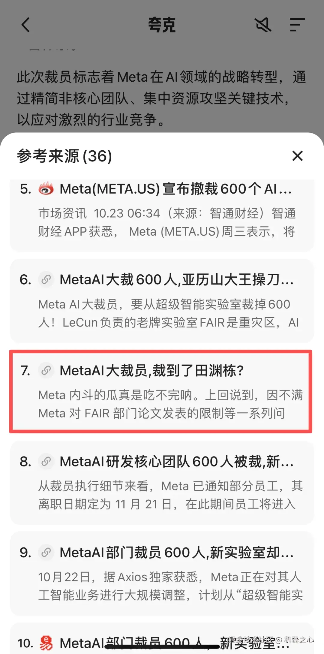 我们索性就让夸克对话助手扒下这事的来龙去脉。输入提示词,点开「深度搜索」,夸克对话助手搜索了 197 篇资料,并从中筛选出符合要求的 38 个参考信源,包括网易、搜狐、新浪新闻等,机器之心也赫然在列。