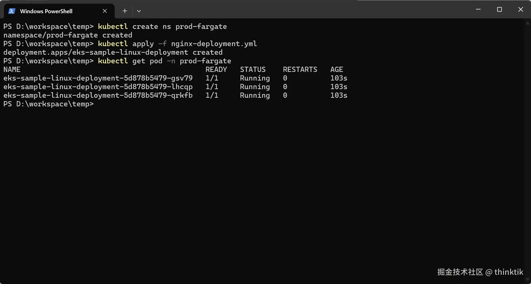 这里是一个简单的nginx deployment样例,请注意它的namesapce必须要和fargate proflie中的namespace设置相匹配 ,匹配规则为AWS Fargate profile