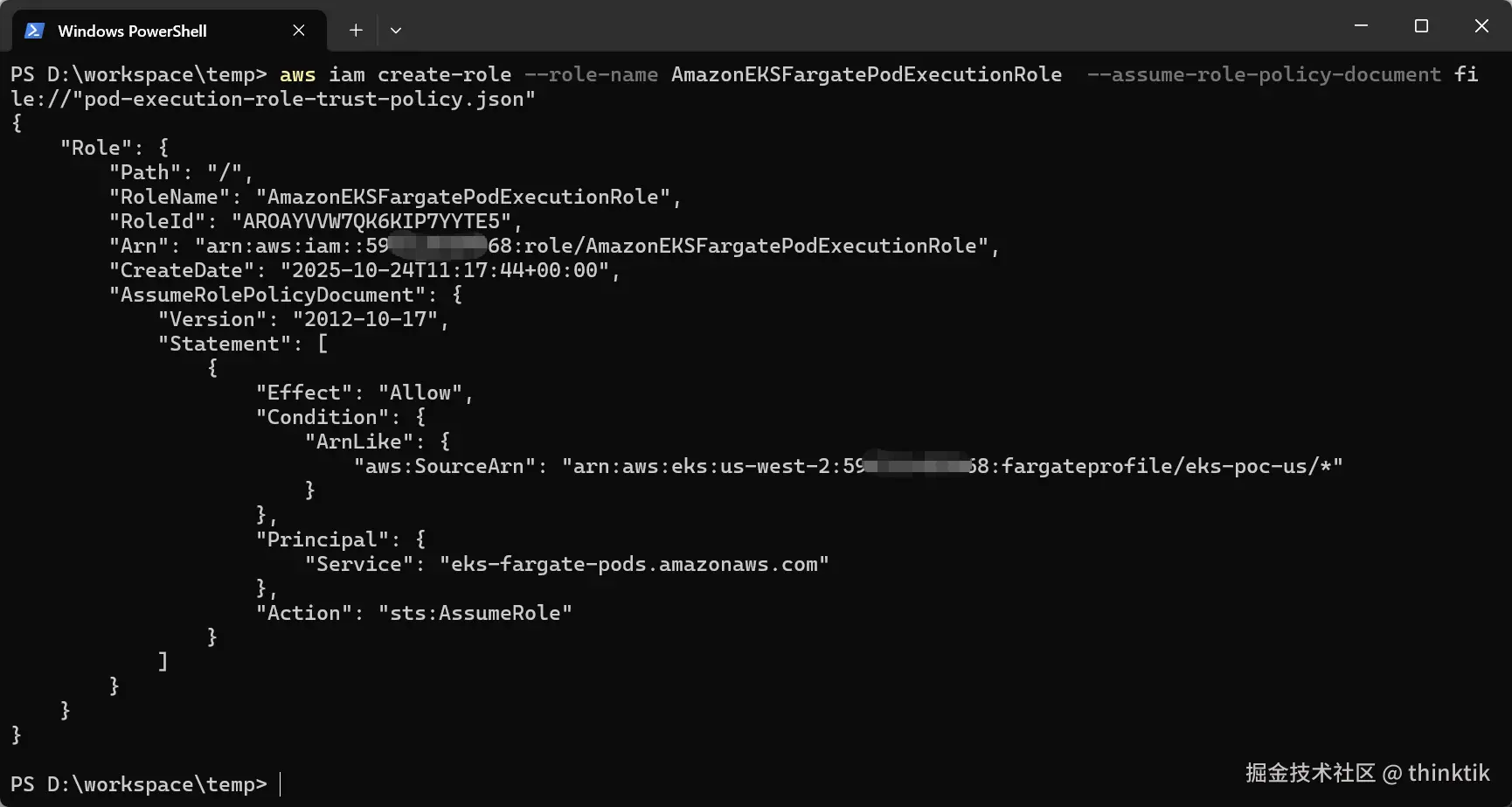 aws iam create-role --role-name AmazonEKSFargatePodExecutionRole --assume-role-policy-document file://"pod-execution-role-trust-policy.json"