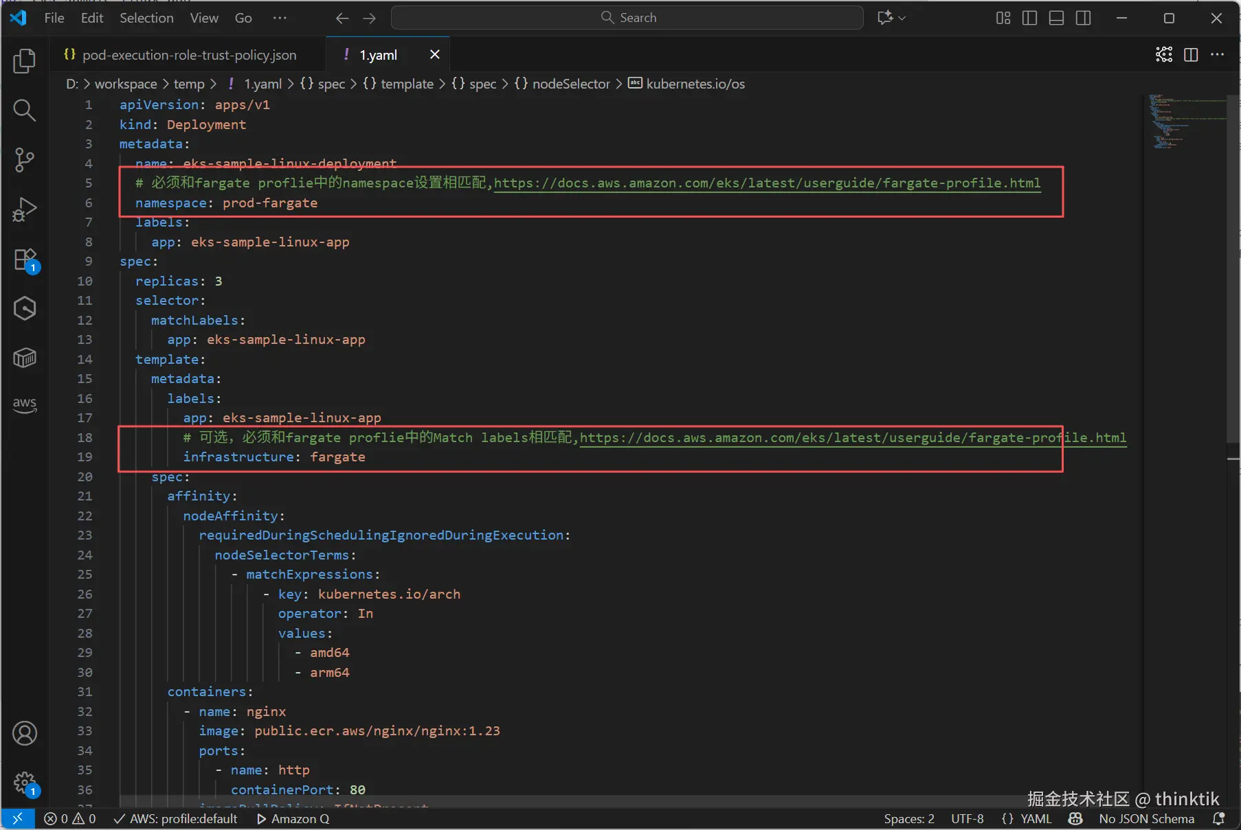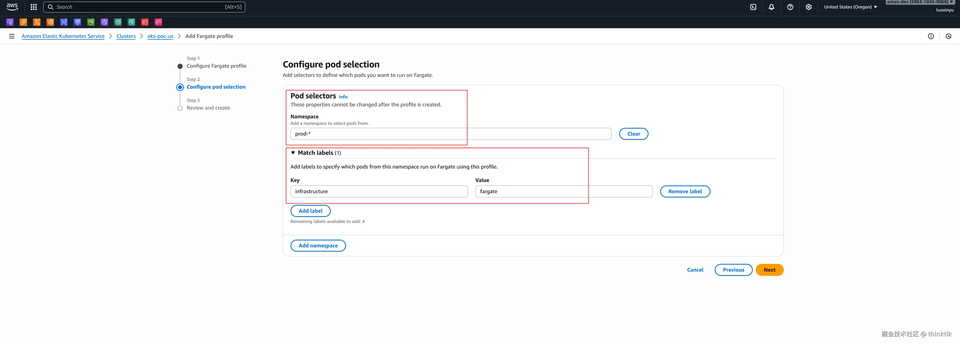 为这个profie填入合适的namespace设置,详情见AWS Fargate profile