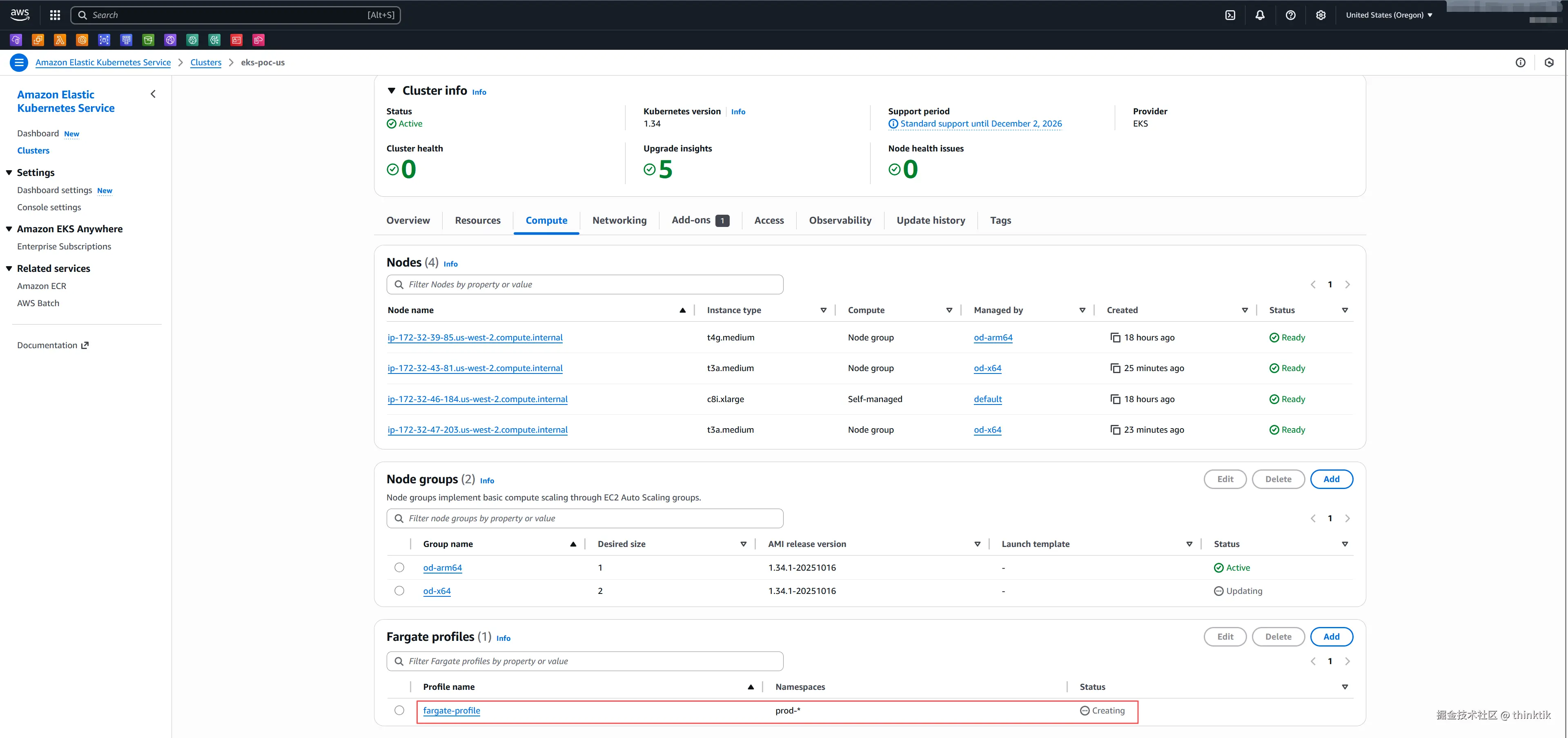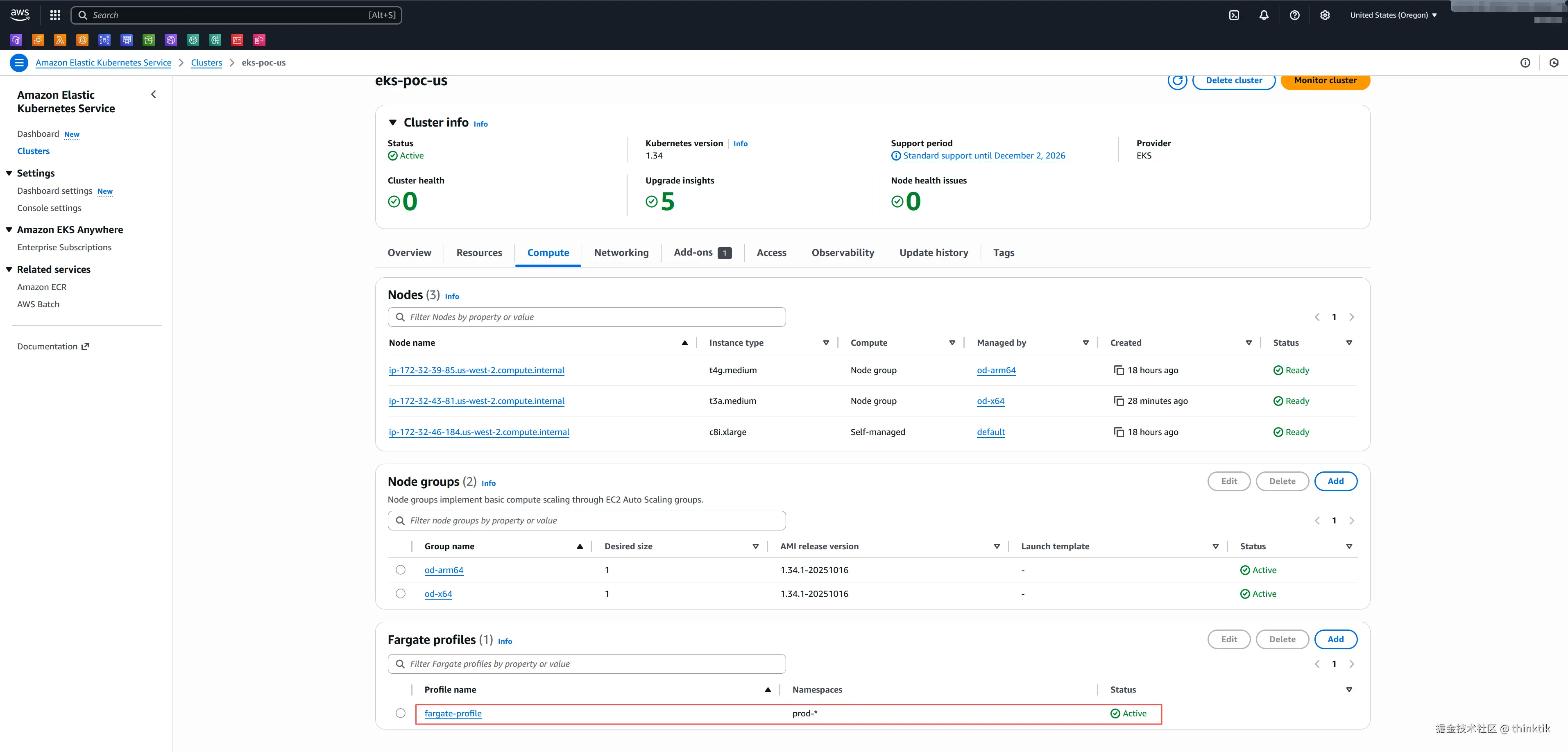 例如下面我设置的pod选择器规则为prod-*,如果pod部署在以prod-开头的namespace中,并且标签选择器为infrastructure=fargate时,那么pod就优先运行在fargate上,而不是默认的EC2上。