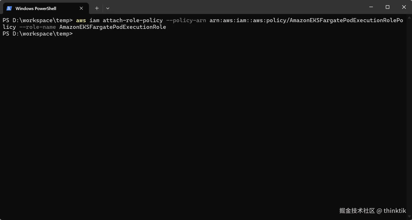 aws iam attach-role-policy --policy-arn arn:aws:iam::aws:policy/AmazonEKSFargatePodExecutionRolePolicy --role-name AmazonEKSFargatePodExecutionRole
