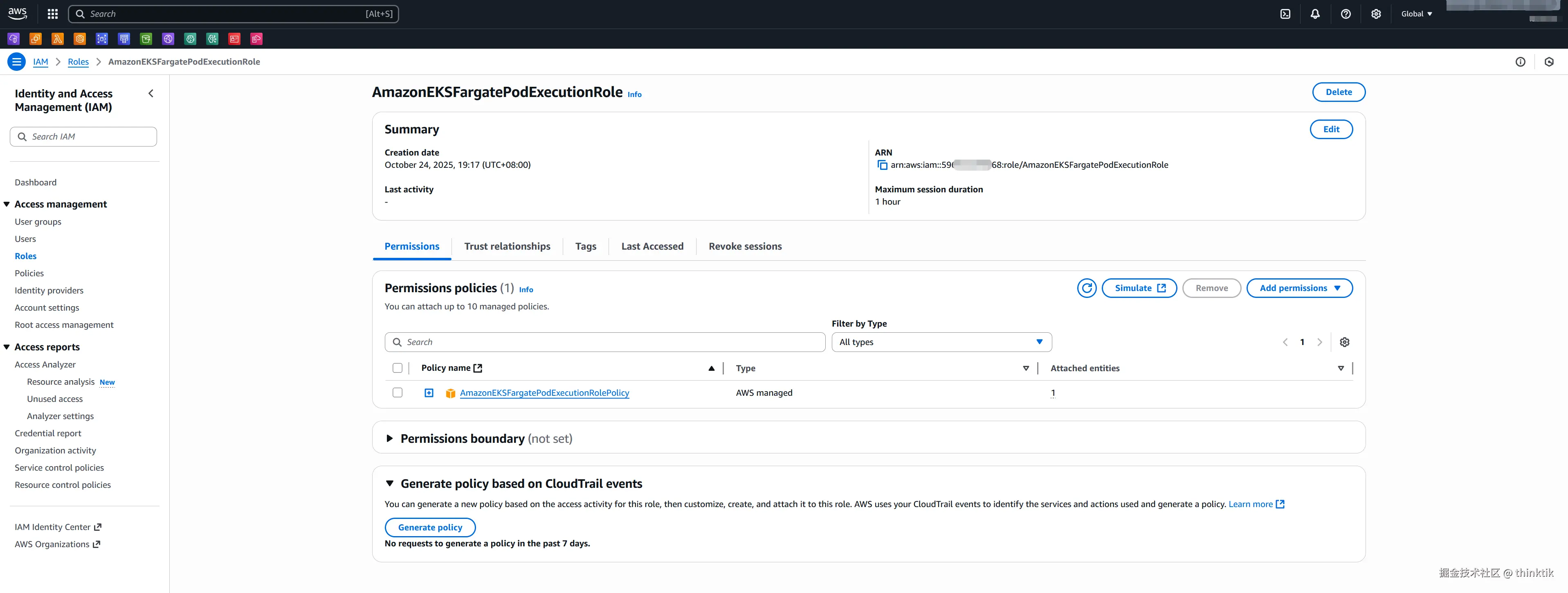 将AmazonEKSFargatePodExecutionRole和AmazonEKSFargatePodExecutionRolePolicy关联