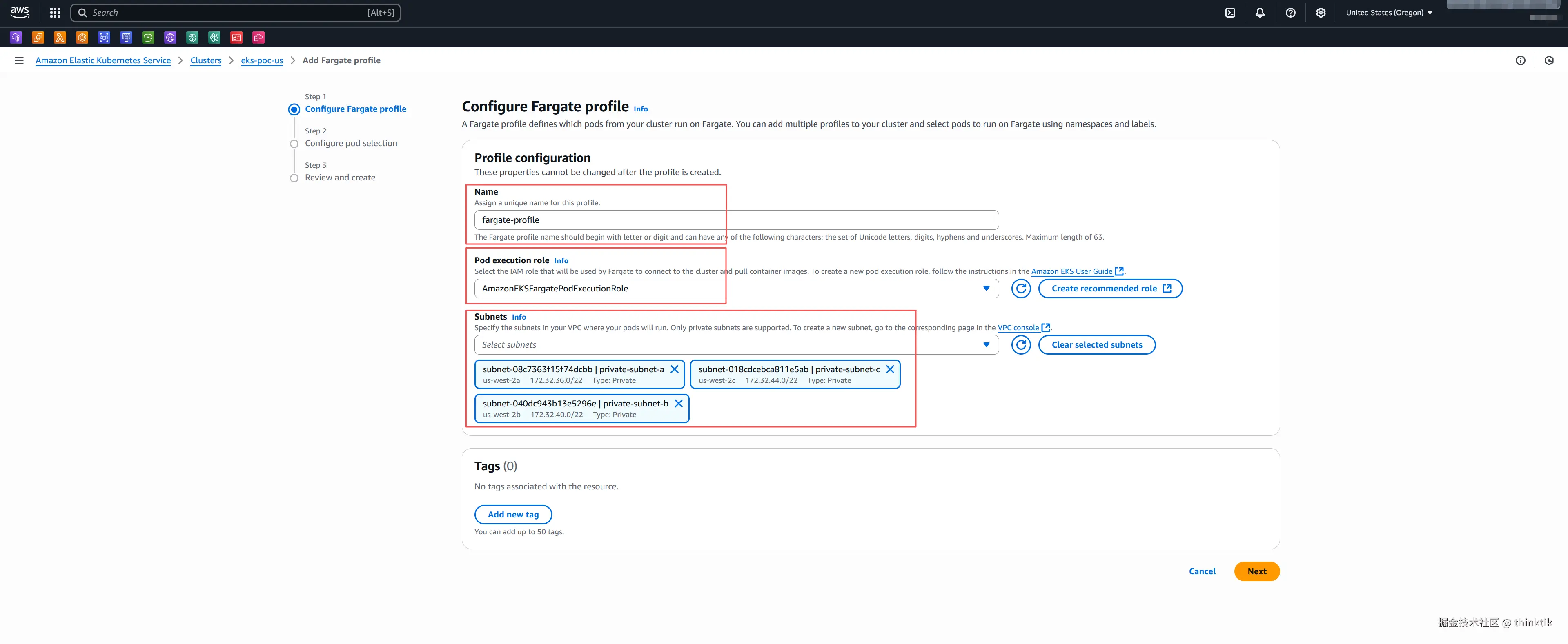 填写自己的fargate profile名称,这里我简单的写成fargate-profile,并选定刚才创建的AmazonEKSFargatePodExecutionRole