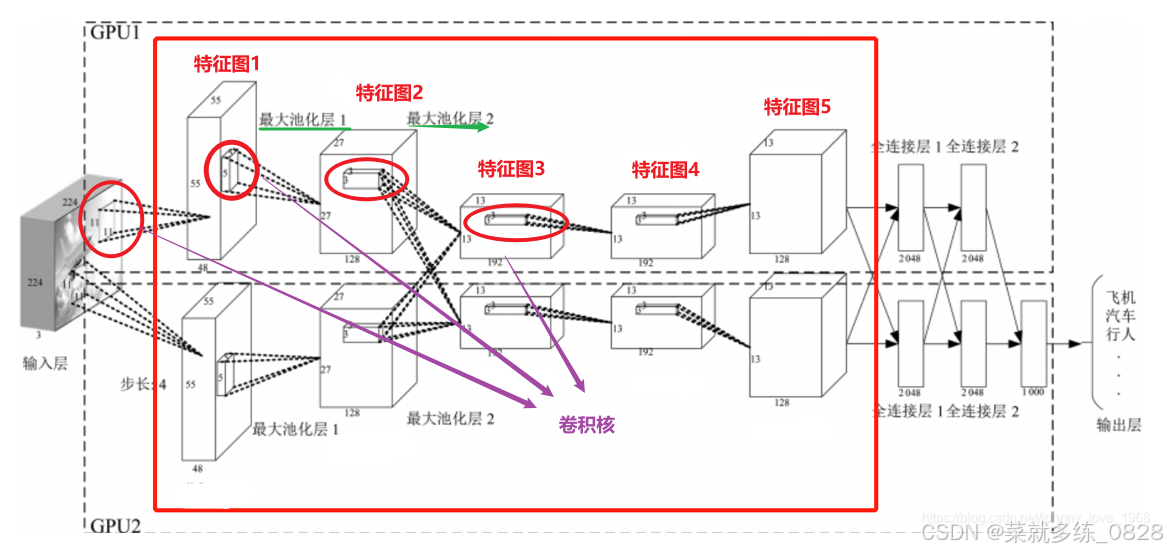 AlexNet:类似LeNet,但更深更大。使用了层叠的卷积层来抓取特征(通常是一个卷积层马上一个max pooling层)