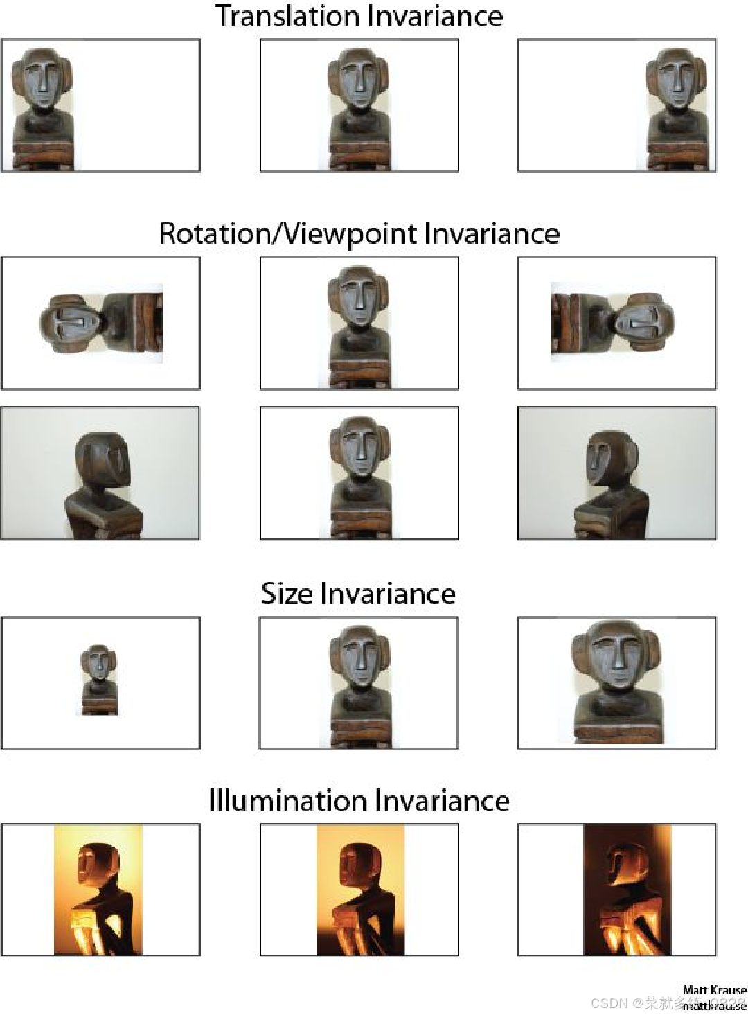 知道一个物体不管在画面左侧还是右侧,都会被识别为同一物体,这一特点就是不变性,例如有一张图片想要使用卷积神经网络训练并识别它,那么就要让他经历位置的旋转、移动、颜色的各种变化等等,对这些图片进行训练然后去识别,能够正确识别即可表示为图像不变性。