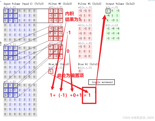 上图表示为,数据窗口每次移动两个步长取3*3的局部数据,即stride=2。 两组神经元(卷积核),即depth=2,意味着有两个滤波器, zero-padding=1。