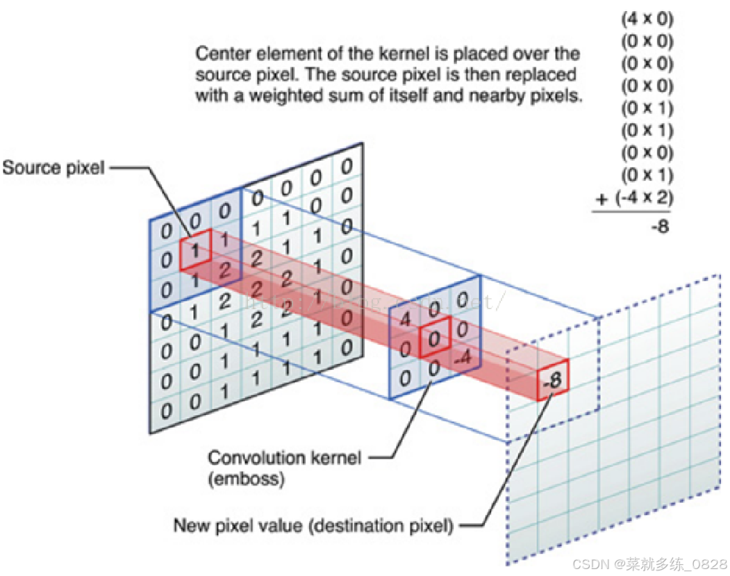 即首先有一张图片,然后设置一个卷积核,将这个卷积核顺序对应图片的每一个位置,将然后使其进行点乘,将相乘的结果求和得到一个值即为卷积后图片的像素点的像素值,最终内积完得到一个结果叫特征图。
