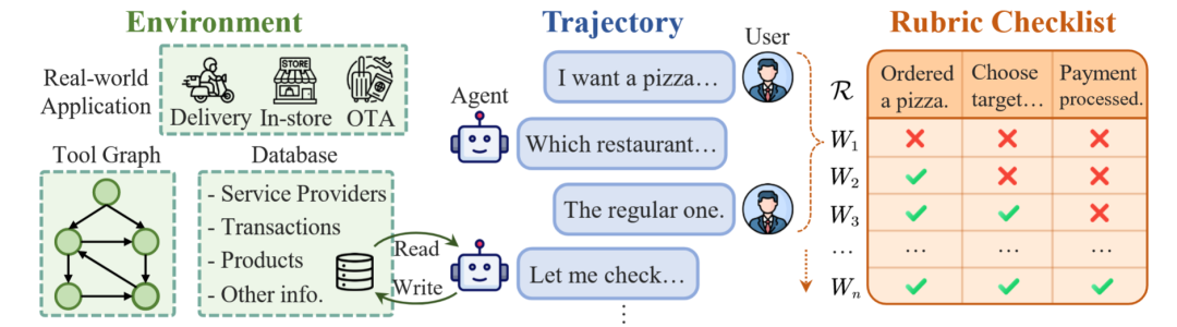 传统的基于数据库状态比对的评估方法难以捕捉商品推荐、行程规划等不改变最终状态的行为,无法对 Agent 完成任务的过程进行有效监督。VitaBench 借鉴最新研究,将任务目标拆解为一组原子化评估准则(Rubric),实现了更全面、细粒度的行为覆盖。