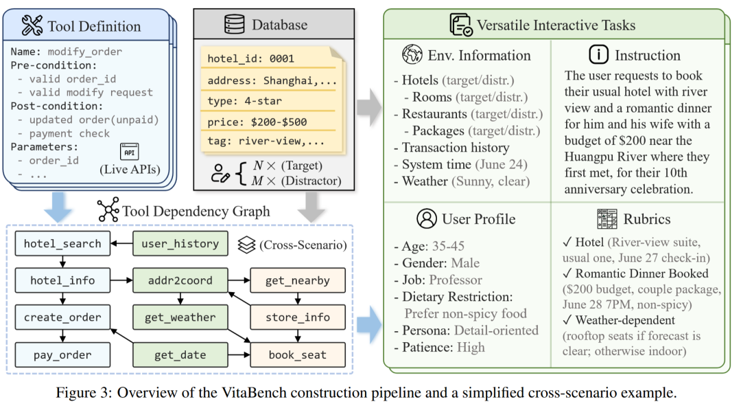 为系统衡量这三重挑战下的模型表现,美团 LongCat 团队构建了 VitaBench,一个依托"生活服务"场景、高度仿真的综合性 Agent 评测基准。