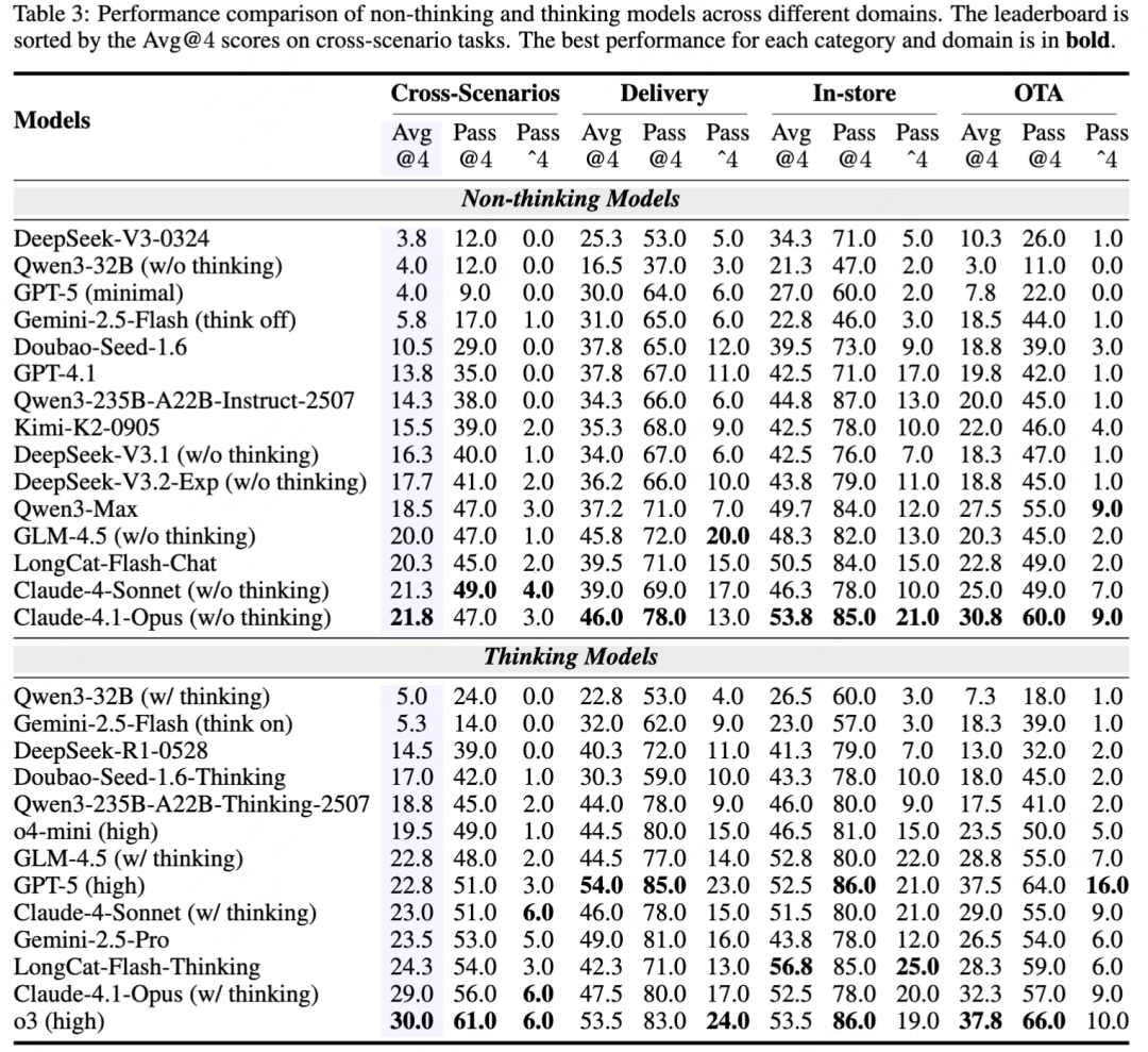 美团 LongCat 团队在 VitaBench 上评测了包括 GPT-5、Claude-4.1-Opus、Gemini-2.5-Pro、Kimi-K2、GLM-4.5、LongCat-Flash 等在内的 20 余款主流大模型。