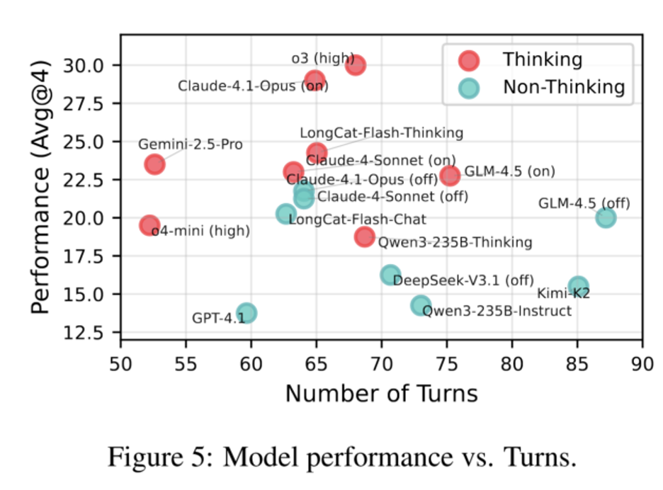 - "思考型"模型显著优于"非思考型":启用链式推理(thinking)的模型普遍提升 5--8 个百分点,且交互轮次更少,说明深度规划对复杂任务至关重要。