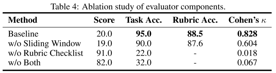 - 滑动窗口评估器:与人工标注相比,Cohen's κ 达 0.828,显著优于无 Rubric 或无滑动窗口的基线方法。