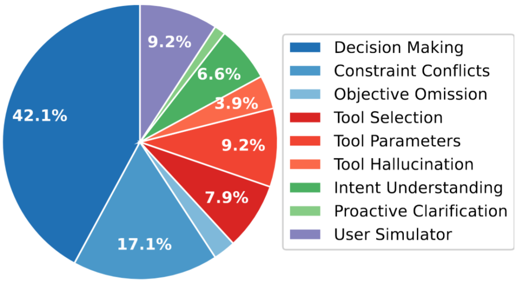 在对模型错误案例的系统分析中,美团 LongCat 团队归纳出三大错误类别:推理相关错误(61.8%)、工具相关错误(21.1%)、交互相关错误(7.9%)。
