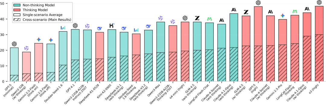 - 跨场景任务带来极大挑战 :即使是测试中表现最佳的 o3(high)模型,跨场景 Avg@4 成功率也仅为 30.0% ,远低于单场景任务的 48.3%,表明当前模型在跨域工具协调与意图整合方面存在根本性短板。