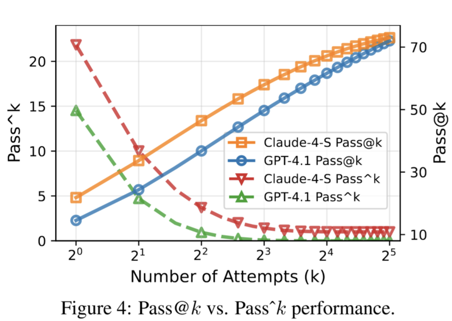 - 多次尝试(探索)可以提升性能,但同样稳定性堪忧:尽管 Pass@4(至少一次成功)可达 60%,但 Pass^4(四次全成功)接近 0%,说明模型行为高度不稳定,难以满足生产环境可靠性要求。