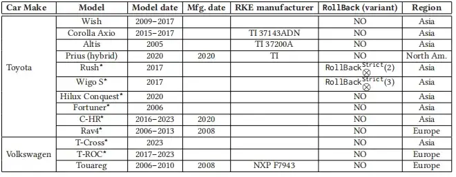 最后一列表明车辆(更准确地说是远程无钥匙进入系统)是否易受 RollBack 攻击(若易受攻击,则标注有效的 RollBack 攻击变体)。