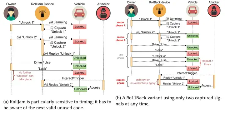 图 2 (a) 总结了 RollJam 攻击的操作流程。当车主按下遥控钥匙上的解锁按钮时,隐藏在目标车辆上或附近的 RollJam 设备会(i)捕获该信号,同时(ii)对车辆接收端所在频段进行干扰,阻止车辆正常接收信号。由于车辆未做出响应,车主会误以为信号接收不良,从而(iii)再次按下同一按钮。然而,此次 RollJam 设备不仅会重复执行步骤(i)和(ii),还会迅速(iv)向车辆重放之前捕获的第一次信号(此时不再进行干扰)。最终,车辆会执行预期的解锁操作。此外,RollJam 设备还会获取该操作对应的下一个有效密码,即攻击者知晓了未来再次解锁车辆所需发送的信号。但如果车主在未受 RollJam 设备干扰的情况下再次使用遥控钥匙解锁车辆,攻击者所持有的信号就会失效,攻击者必须重新执行整个攻击流程才能再次解锁车辆。尽管 RollJam 攻击通常能有效突破所有基于滚动码的远程无钥匙进入系统,但由于步骤(iv)的存在,攻击者需要时刻谨慎操作并持续监控。