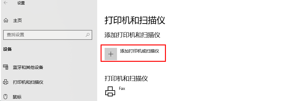 打开windows设置页,找到打印机和扫描仪页。点击添加打印机或扫描仪。
