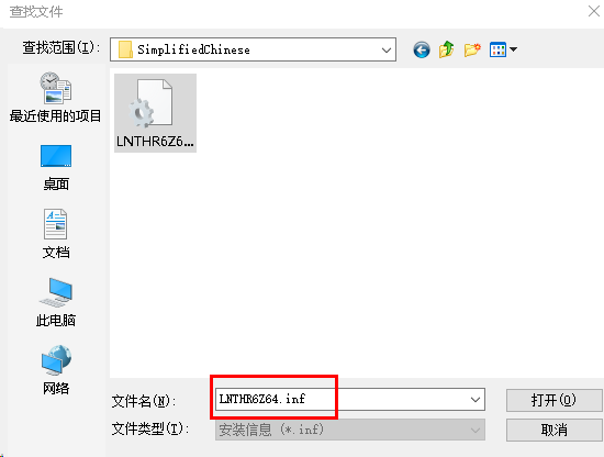 点选"LNTHR6Z64.inf",点击打开按钮,至此安装完成。